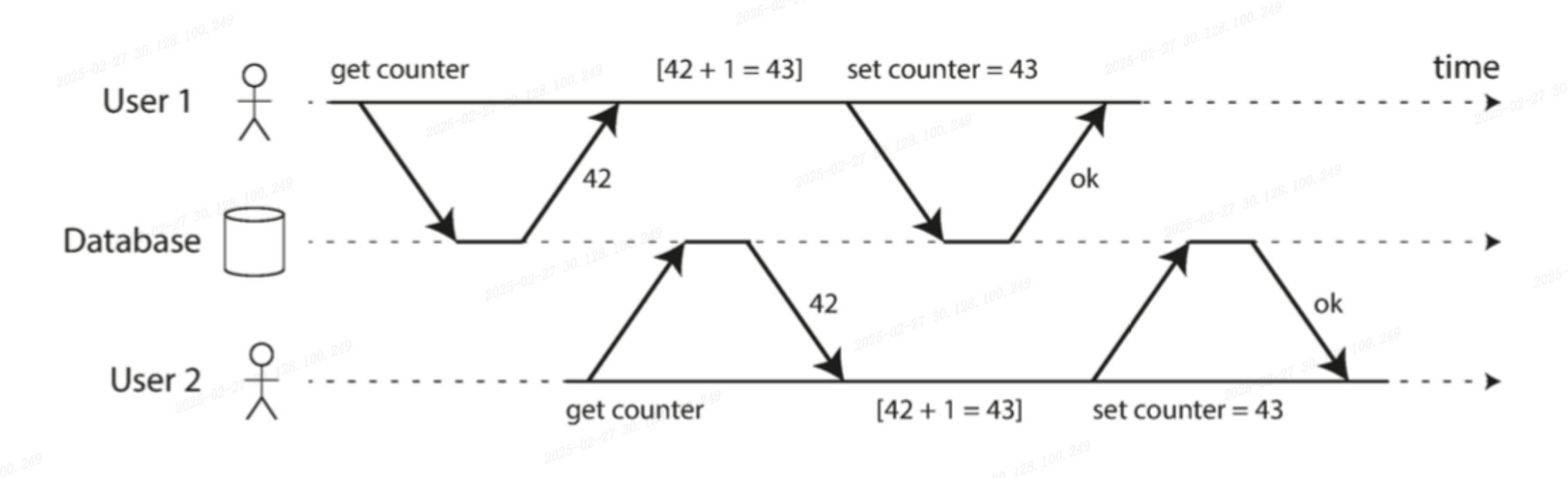 isolation隔离性,隔离性意味着,同时执行的事务是相互隔离的:它们不能相互冒犯。在事务执行时不可避免被多个线程同时操作一条数据,例如一个值做加法,A拿到42,进行加一,在加的过程中B也拿到了42,也进行加一操作,这是A把结果43更新,B也把结果43更新,因为发生了两次增长,值应该从42增至44;但由于竞态条件,实际上只增至 43,如下图 。