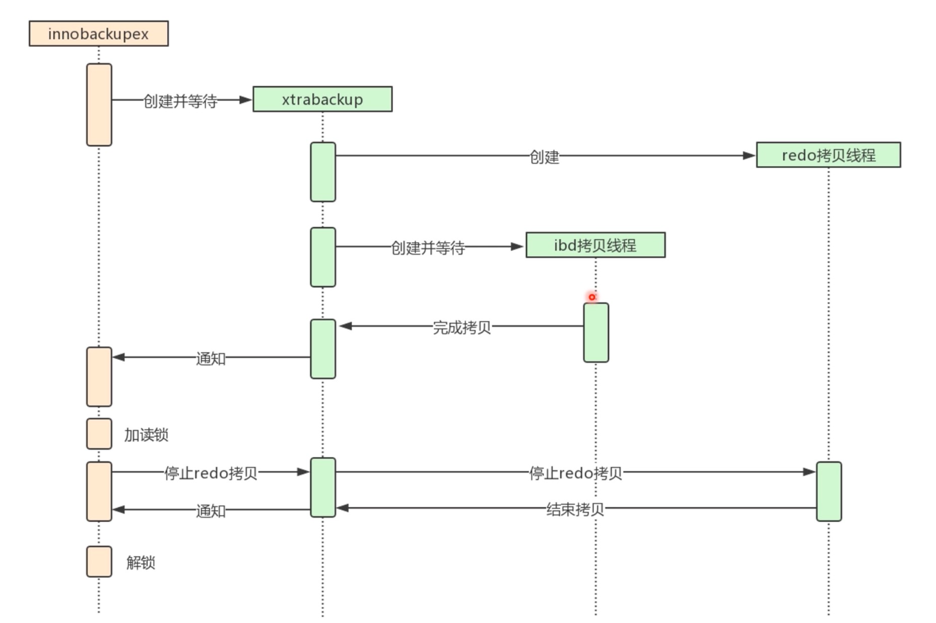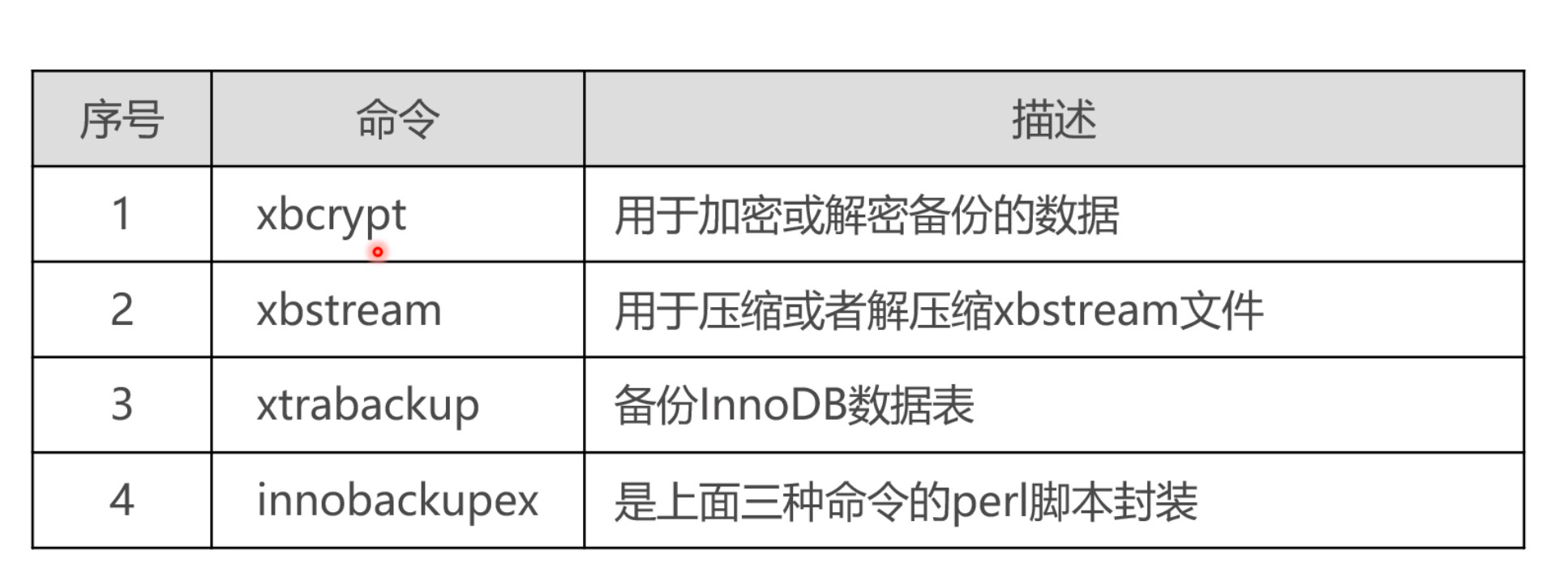 备份命令: xbstream :流式压缩,节省IO,tar压缩要先创建文件,流式压缩可以边生成边压缩 innobackupex :总命令,包含其它命令,对MYISAM存储引擎,只能全量备份;对innodb引擎可以做增量备份,只存在于2.4版本,8版本已取消 4、xtrabackup做全量热备份 #普通热备份 innobackupex --defaults-file=/etc/my.cnf --host=*.*.*.* --user=* --password=* --port=3306 /home/
