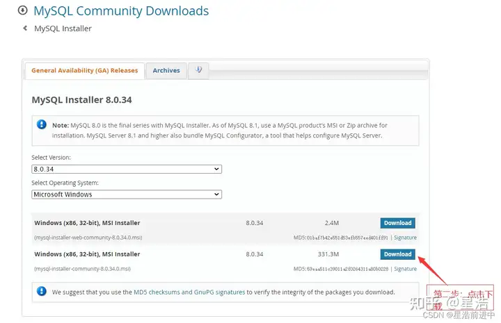 从官网下载MySQL,这里我选用的是Mysql8.0.34版本