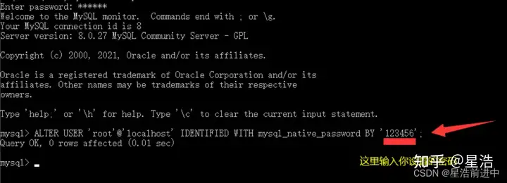 2、进入mysql,执行下面语句:ALTER USER 'root'@'localhost' IDENTIFIED WITH mysql_Native_password BY '123456';