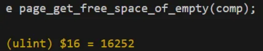 GDB执行一下,可以看到一个16k的PAGE实际可用的空间为16252字节(页头等占用了小量字节)。一半粗略算作是8k。