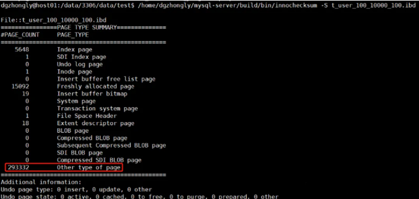 使用官方工具innochecksum查看表空间文件PAGE类型分布,可以看到,B表相对A表多了大量的Other type of page。看来主要的空间消耗是在这个“Other”上。