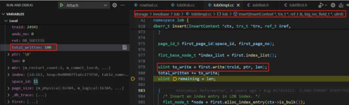 以下是B表插入数据,往innodb"Off page"写入数据时候的断点,可以看到只写了B表单列100字节数据。16KB的容量只写100字节的数据,剩余99%的空间用不上,实在太浪费了。