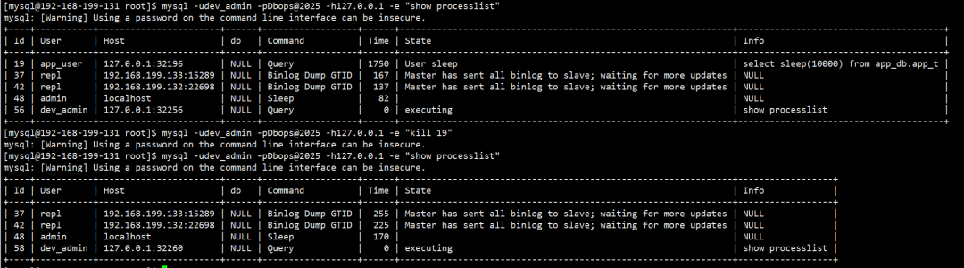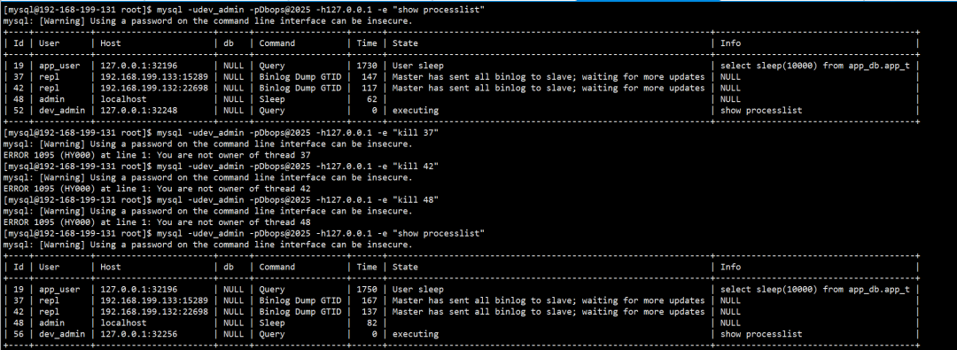 这意味着,即便业务用户拥有了 PROCESS 权限,他们也无法干扰数据库的后台线程,比如主从复制线程、事件调度线程(Event Scheduler)或管理员的命令行。这种设计极大地提升了系统的稳定性,避免了权限滥用带来的潜在风险。