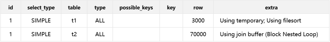 通过Explain初步分析:两张表均执行了全表扫描,结合两张表的数据规模分析全表扫描并非耗时达到分钟级的主要原因。另外执行计划extra种提示的Using temporary; Using filesort; Using join buffer (Block Nested Loop)又分别代表什么含义呢?