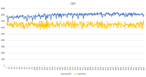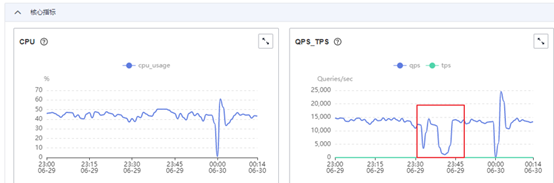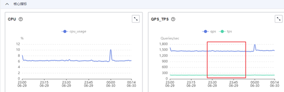 可以观察到压力上涨触发存储层流控后,较大写入压力的计算节点实例的QPS下降,系统处于限流状态。恢复阈值后,限流状态解除,业务QPS恢复,如图6 QPS所示。同时,较小写入压力的计算节点实例,对QPS无影响,如图7 QPS所示。