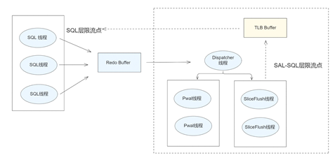 第一个限速点在SAL-SQL层。SliceFlush线程将每个Slice的日志发送给存储服务,此时,系统需要进行限速判断,具体这里包括以下几点: