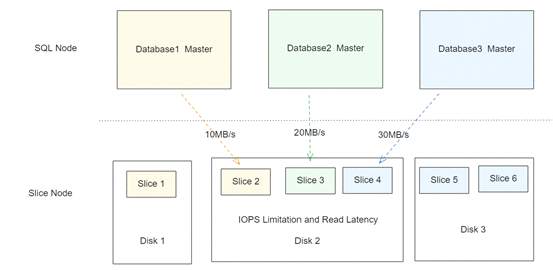 如图3所示,3个数据库实例共有6个Slice分配到当前存储节点,当前周期总的写入速度是30MB/s, 平均分配给每个Slice 的配额是5MB/s。