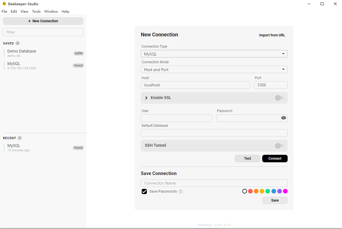 保存连接信息需要设置连接名称,支持设置数据库主题颜色。