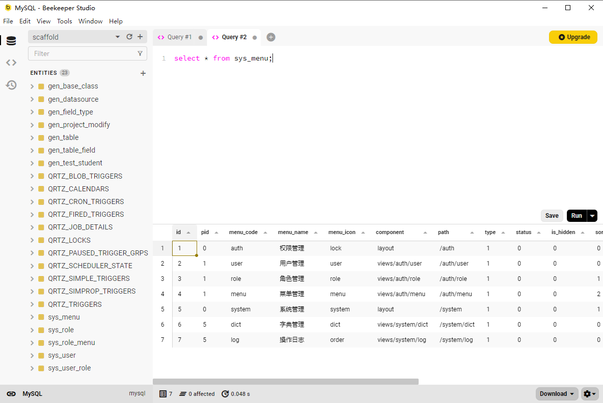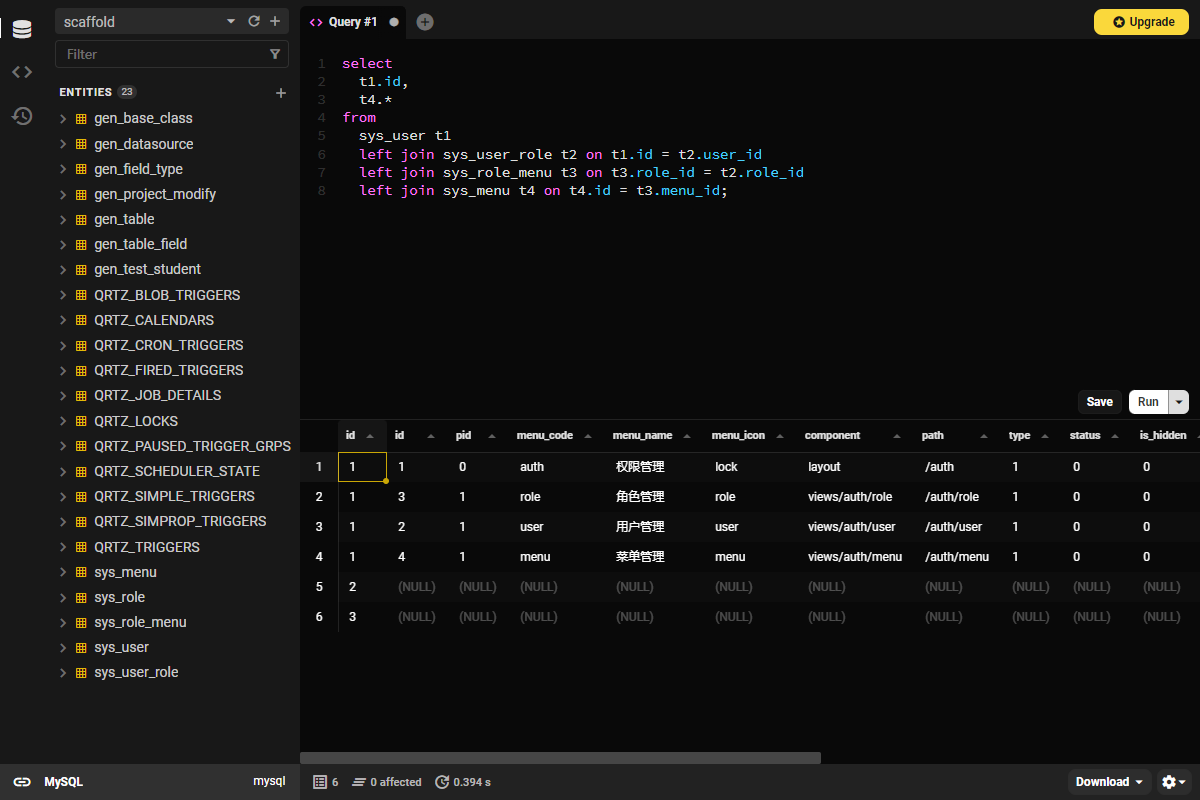 5、右侧可以添加多个查询会话,SQL 编辑器提供了表名和字段名的字段补全功能,编写完成之后,点击 Run 按钮运行查询