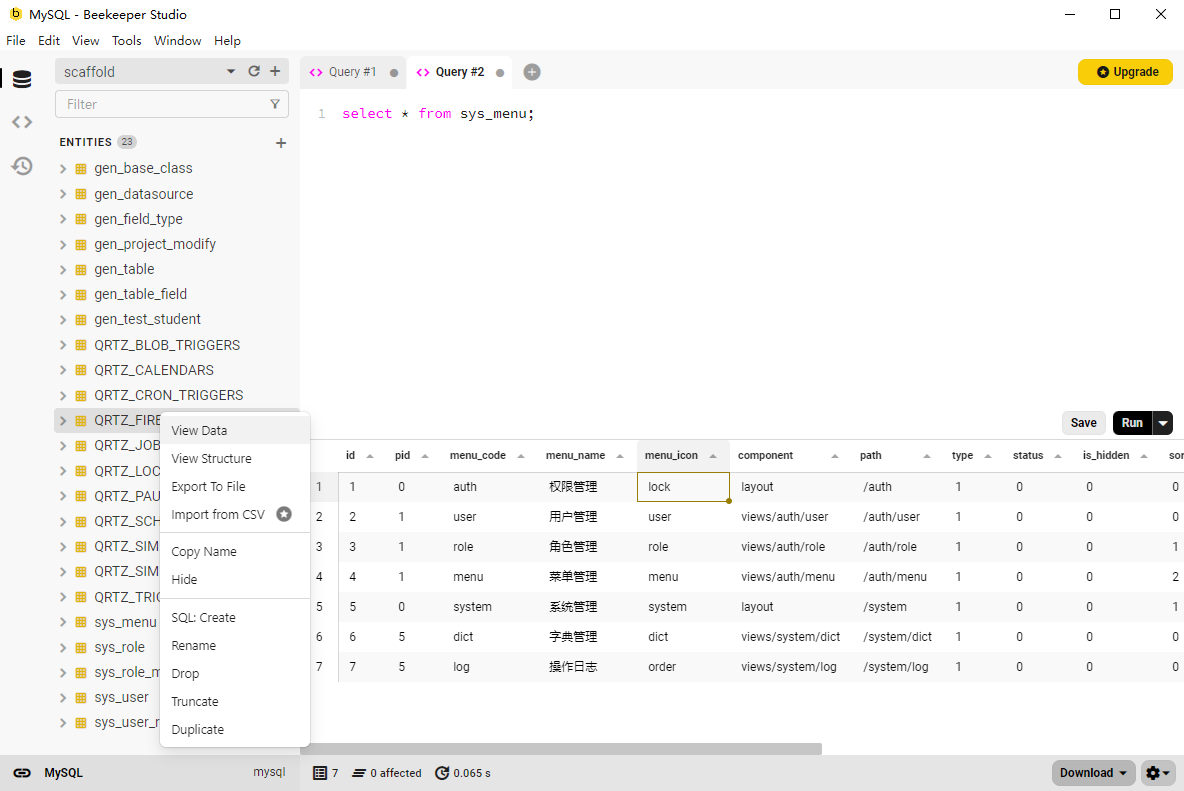 4、右键点击左侧列表中的表名,可以查看并编辑表中的数据、查看并编辑表结构、导出表中的数据以及生成建表语句等