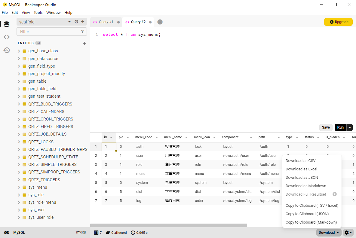 按钮提供了 CSV、Excel、JSON、Markdown 多种格式的数据导出功能