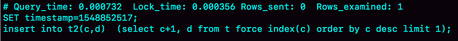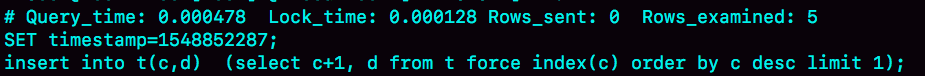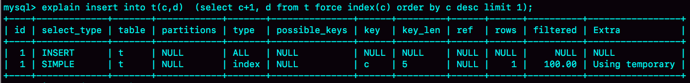 insert into temp_t (select c+1, d from t force index(c) order by c desc limit 1);