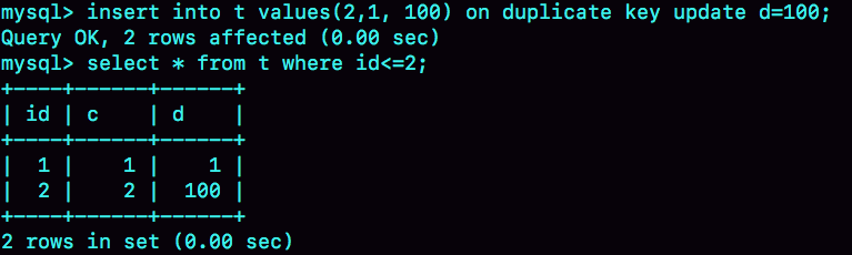 需要注意的是,执行这条语句的 affected rows 返回的是 2,很容易造成误解。实际上,真正更新的只有一行,只是在代码实现上,insert 和 update 都认为自己成功了,update 计数加了 1, insert 计数也加了 1。