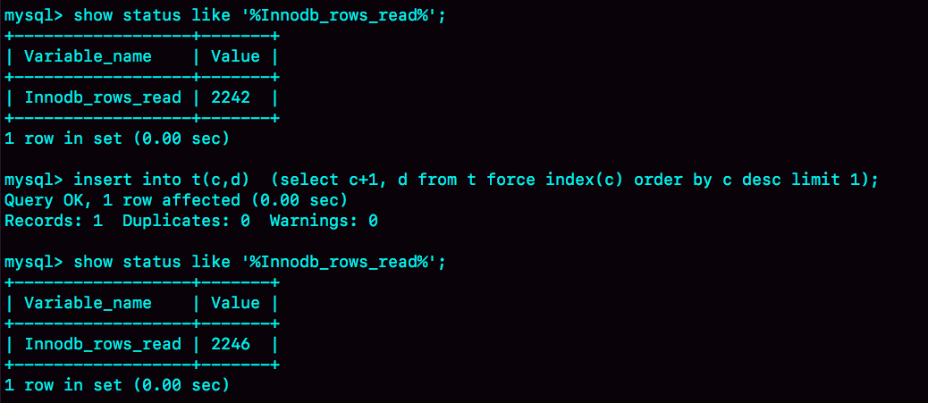 从另一个角度考虑的话,我们可以看看 InnoDB 扫描了多少行。如图 5 所示,是在执行这个语句前后查看 Innodb_rows_read 的结果。