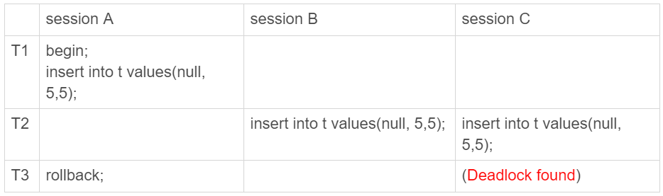 在 session A 执行 rollback 语句回滚的时候,session C 几乎同时发现死锁并返回。