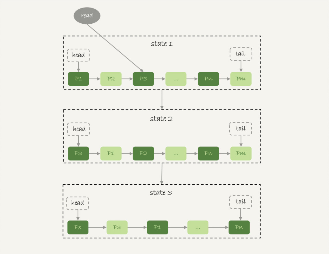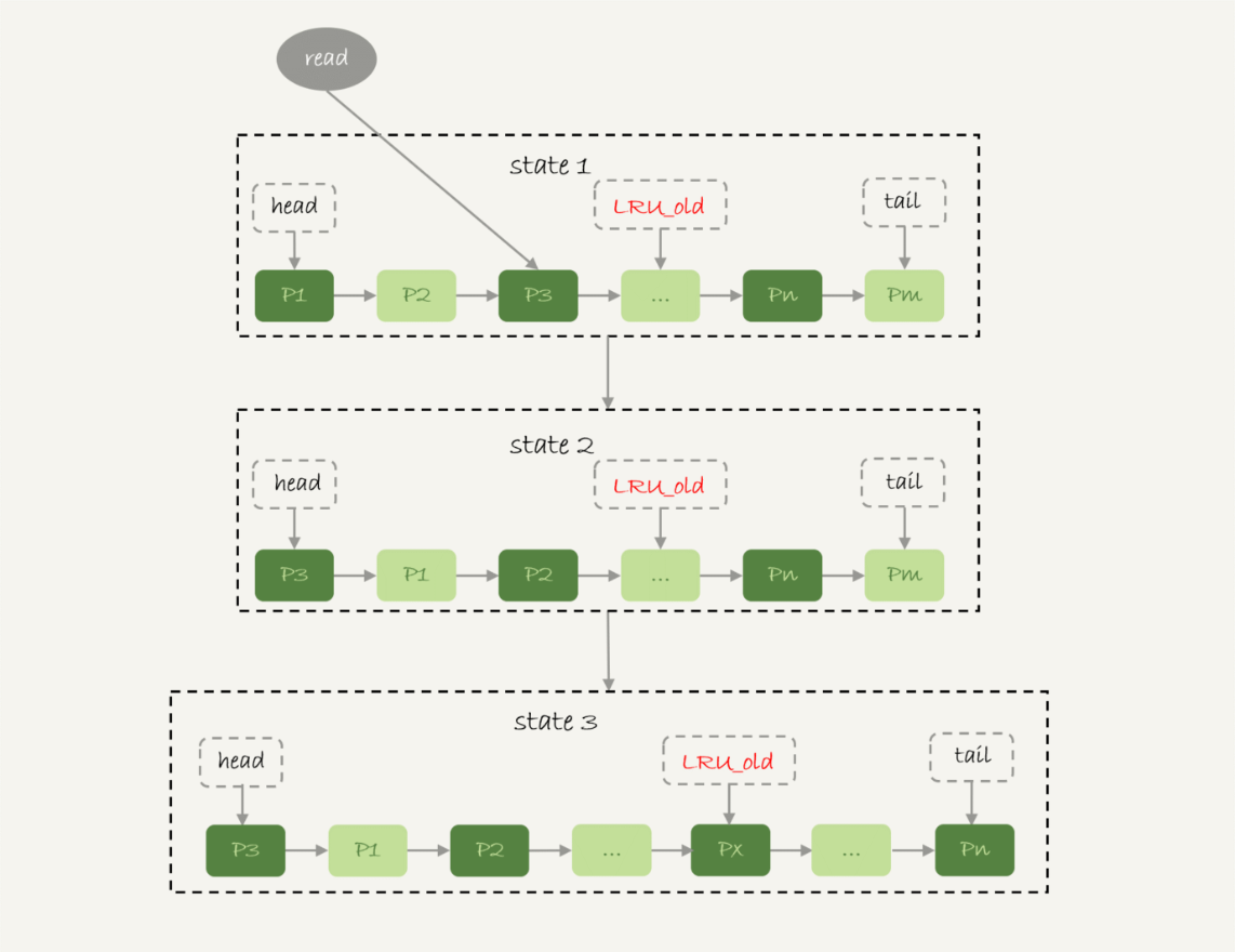 InnoDB 内存管理用的是最近最少使用 (Least Recently Used, LRU) 算法,这个算法的核心就是淘汰最久未使用的数据。下图是一个 LRU 算法的基本模型。