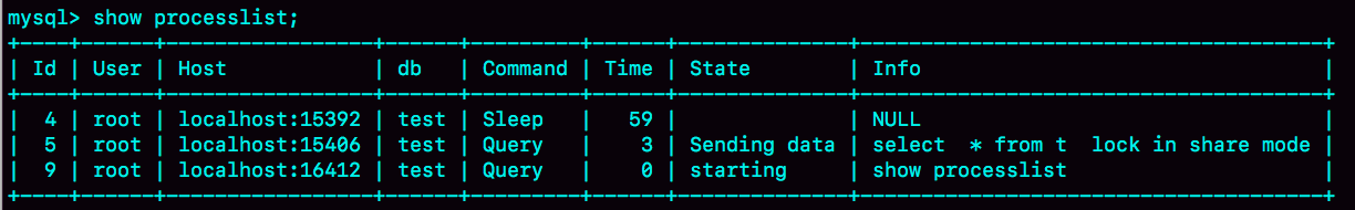 也就是说,“Sending data”并不一定是指“正在发送数据”,而可能是处于执行器过程中的任意阶段。比如,你可以构造一个锁等待的场景,就能看到 Sending data 状态。