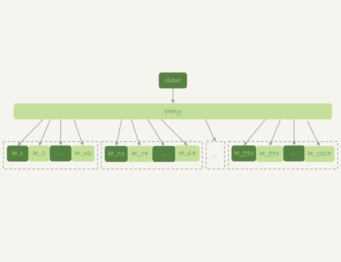 一般分库分表的场景,就是要把一个逻辑上的大表分散到不同的数据库实例上。比如。将一个大表 ht,按照字段 f,拆分成 1024 个分表,然后分布到 32 个数据库实例上。如下图所示: