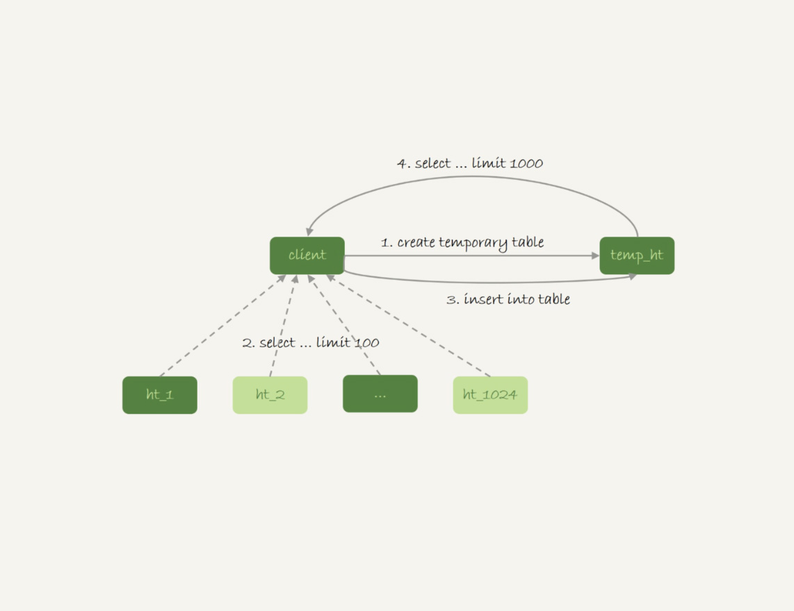 在实践中,我们往往会发现每个分库的计算量都不饱和,所以会直接把临时表 temp_ht 放到 32 个分库中的某一个上。这时的查询逻辑与图 3 类似,你可以自己再思考一下具体的流程。为什么临时表可以重名?你可能会问,不同线程可以创建同名的临时表,这是怎么做到的呢?