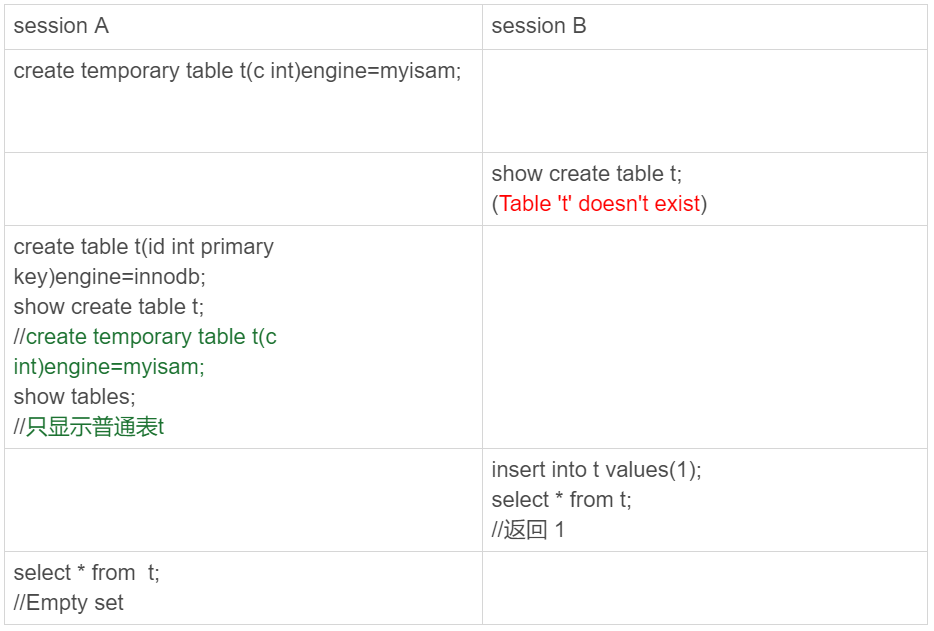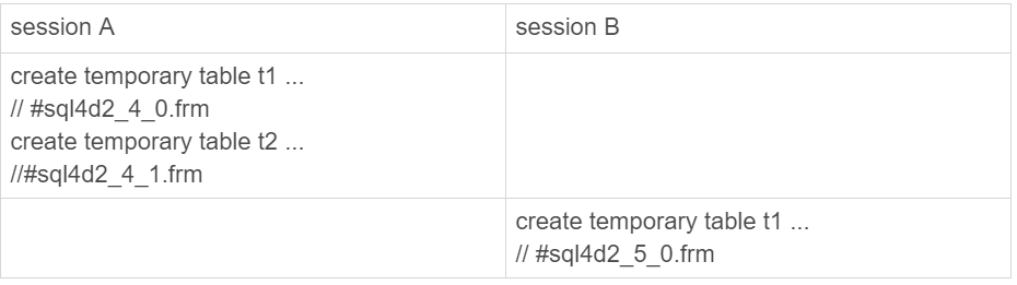 也就是说,session A 和 sessionB 创建的两个临时表 t1,它们的 table_def_key 不同,磁盘文件名也不同,因此可以并存。