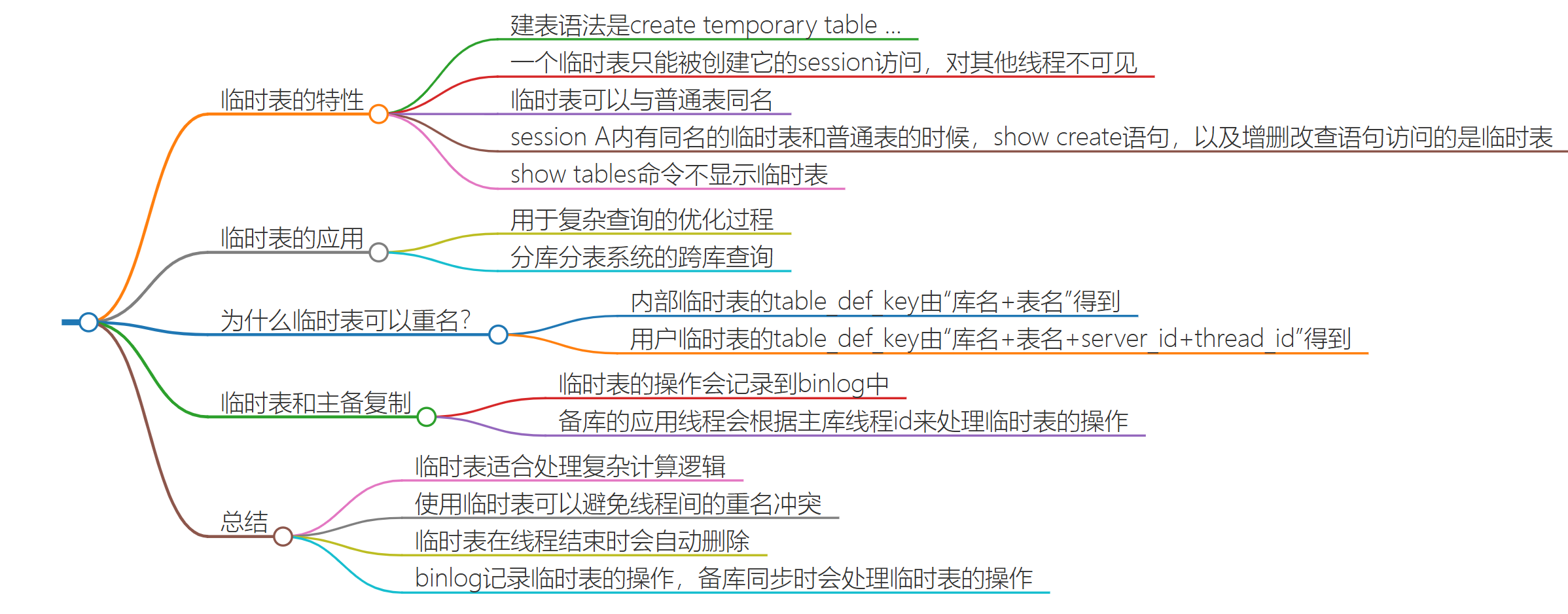 今天这篇文章,我和你介绍了临时表的用法和特性。在实际应用中,临时表一般用于处理比较复杂的计算逻辑。由于临时表是每个线程自己可见的,所以不需要考虑多个线程执行同一个处理逻辑时,临时表的重名问题。在线程退出的时候,临时表也能自动删除,省去了收尾和异常处理的工作。