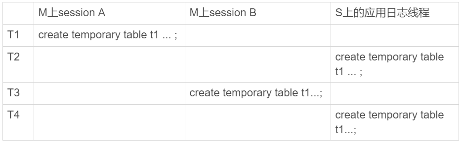 主库 M 上的两个 session 创建了同名的临时表 t1,这两个 create temporary table t1 语句都会被传到备库 S 上。但是,备库的应用日志线程是共用的,也就是说要在应用线程里面先后执行这个 create 语句两次。(即使开了多线程复制,也可能被分配到从库的同一个 worker 中执行)。