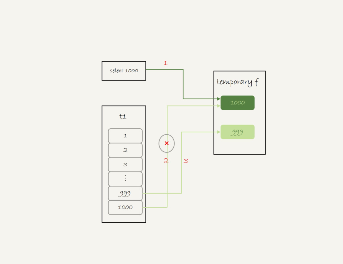由于表 t1 中的 id 值是从 1 开始的,因此返回的结果集中第一行是 id=1;扫描到 id=10 的时候才插入 m=0 这一行,因此结果集里最后一行才是 m=0。