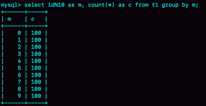select id%10 as m, count(*) as c from t1 group by m order by null;