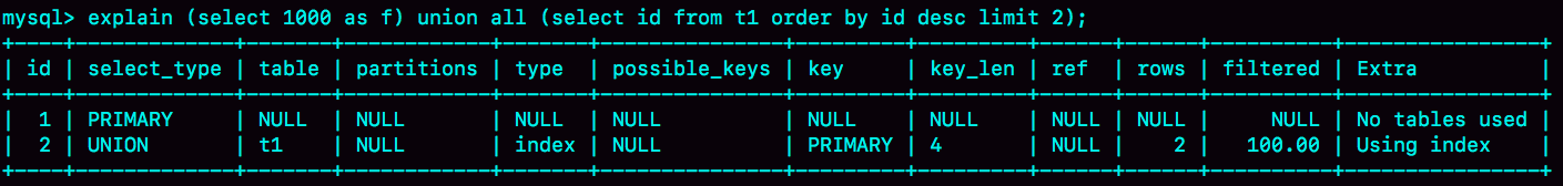 (select 1000 as f) union (select id from t1 order by id desc limit 2);