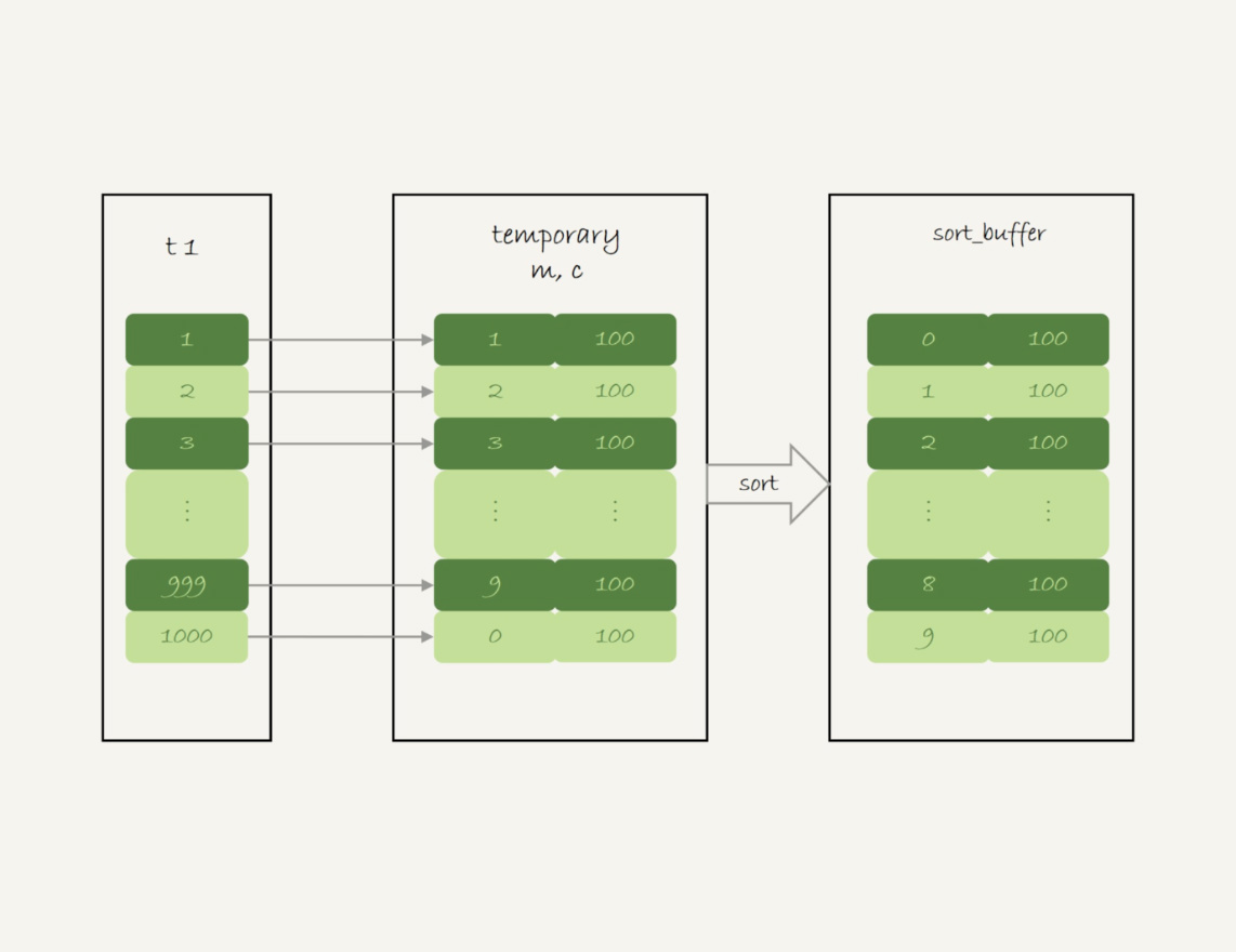 把内存临时表的大小限制为最大 1024 字节,并把语句改成 id % 100,这样返回结果里有 100 行数据。但是,这时的内存临时表大小不够存下这 100 行数据,也就是说,执行过程中会发现内存临时表大小到达了上限(1024 字节)。