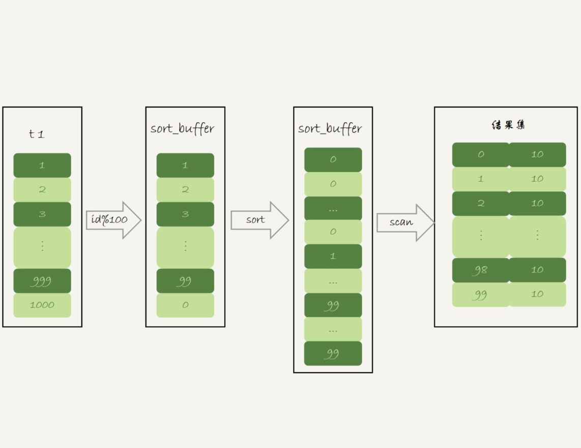 但是,由于每一行的 id%100 的结果是无序的,所以我们就需要有一个临时表,来记录并统计结果。那么,如果扫描过程中可以保证出现的数据是有序的,是不是就简单了呢?