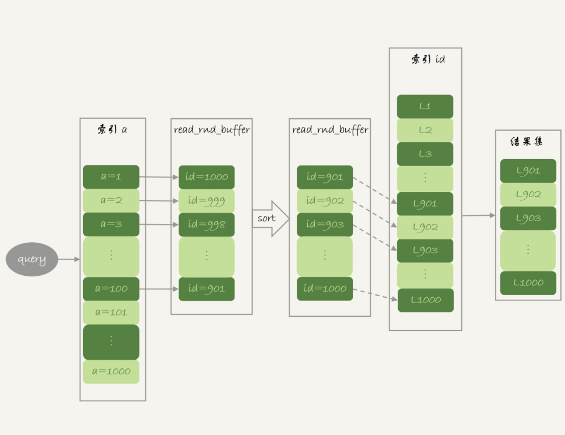 如果步骤 1 中,read_rnd_buffer 放满了,就会先执行完步骤 2 和 3,然后清空 read_rnd_buffer。之后继续找索引 a 的下个记录,并继续循环。