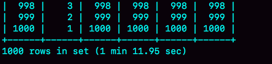 可以看到,整个过程 3 个语句执行时间的总和还不到 1 秒,相比于前面的 1 分 11 秒,性能得到了大幅提升。