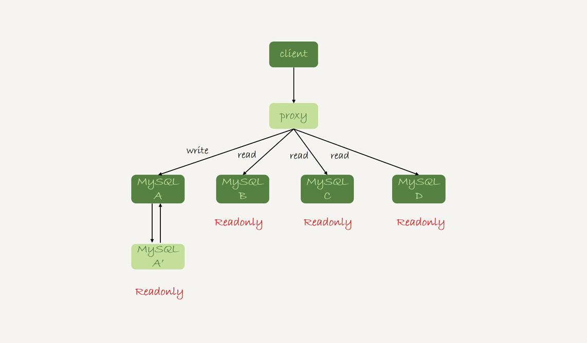 还有一种架构是,在 MySQL 和客户端之间有一个中间代理层 proxy,客户端只连接 proxy, 由 proxy 根据请求类型和上下文决定请求的分发路由。