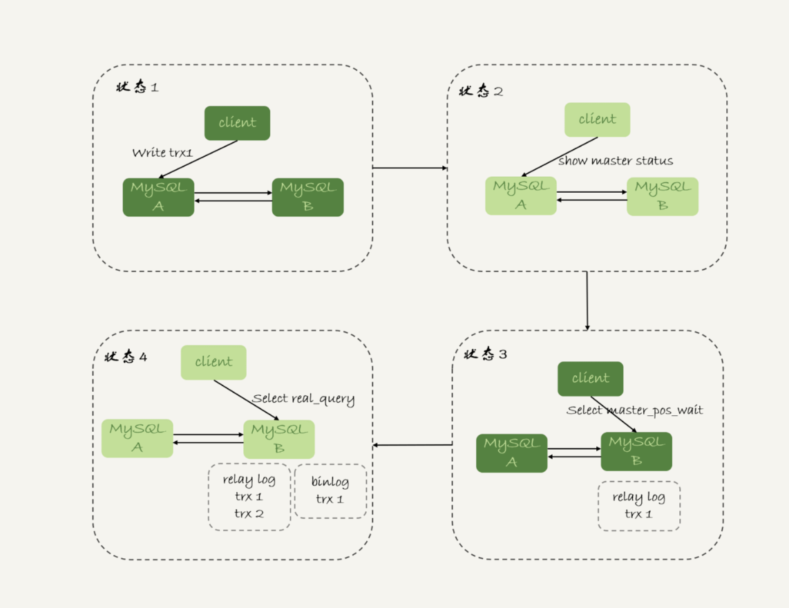 图中备库 B 下的虚线框,分别表示 relaylog 和 binlog 中的事务。可以看到,图 5 中从状态 1 到状态 4,一直处于延迟一个事务的状态。备库 B 一直到状态 4 都和主库 A 存在延迟,如果用上面必须等到无延迟才能查询的方案,select 语句直到状态 4 都不能被执行。但是,其实客户端是在发完 trx1 更新后发起的 select 语句,我们只需要确保 trx1 已经执行完成就可以执行 select 语句了。也就是说,如果在状态 3 执行查询请求,得到的就是预期结果了。
