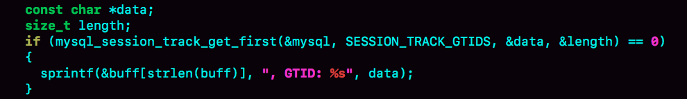 这里我再回答一下。其实,MySQL 并没有提供这类接口的 SQL 用法,是提供给程序的 API(https://dev.mysql.com/doc/refman/5.7/en/c-api-functions.html)。比如,为了让客户端在事务提交后,返回的 GitD 能够在客户端显示出来,我对 MySQL 客户端代码做了点修改,如下所示: