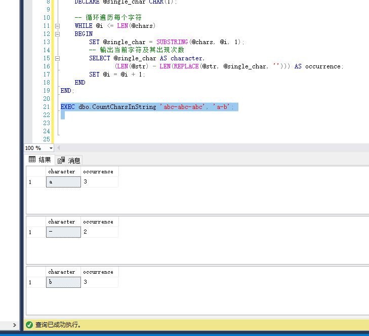这个存储过程 CountCharsInString 使用 WHILE 循环逐个字符处理 @chars 中的字符,并输出它们在 @str 中的出现次数。