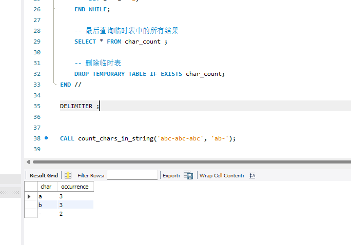 这个存储过程 count_chars_in_string 通过循环遍历 chars 中的每个字符,计算它们在 str 中的出现次数,然后用临时表保存输出结果。