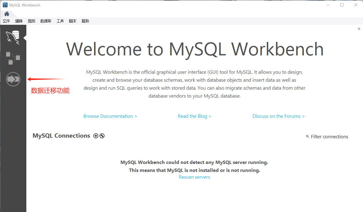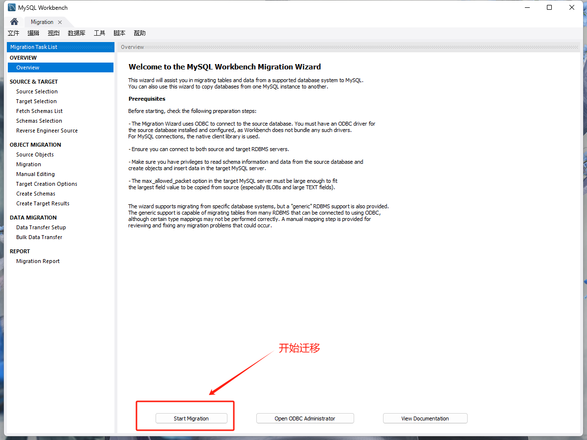 双击打开MySQL workbench,点击数据迁移功能,再点击开始迁移按钮