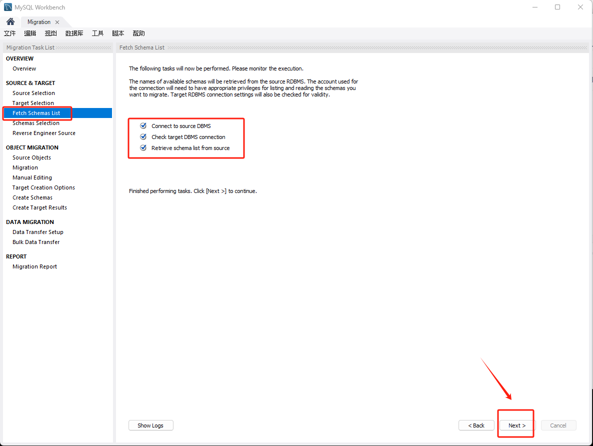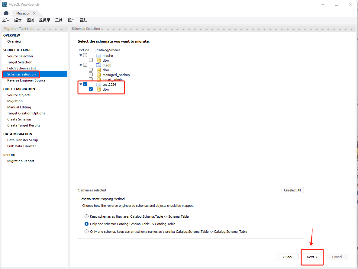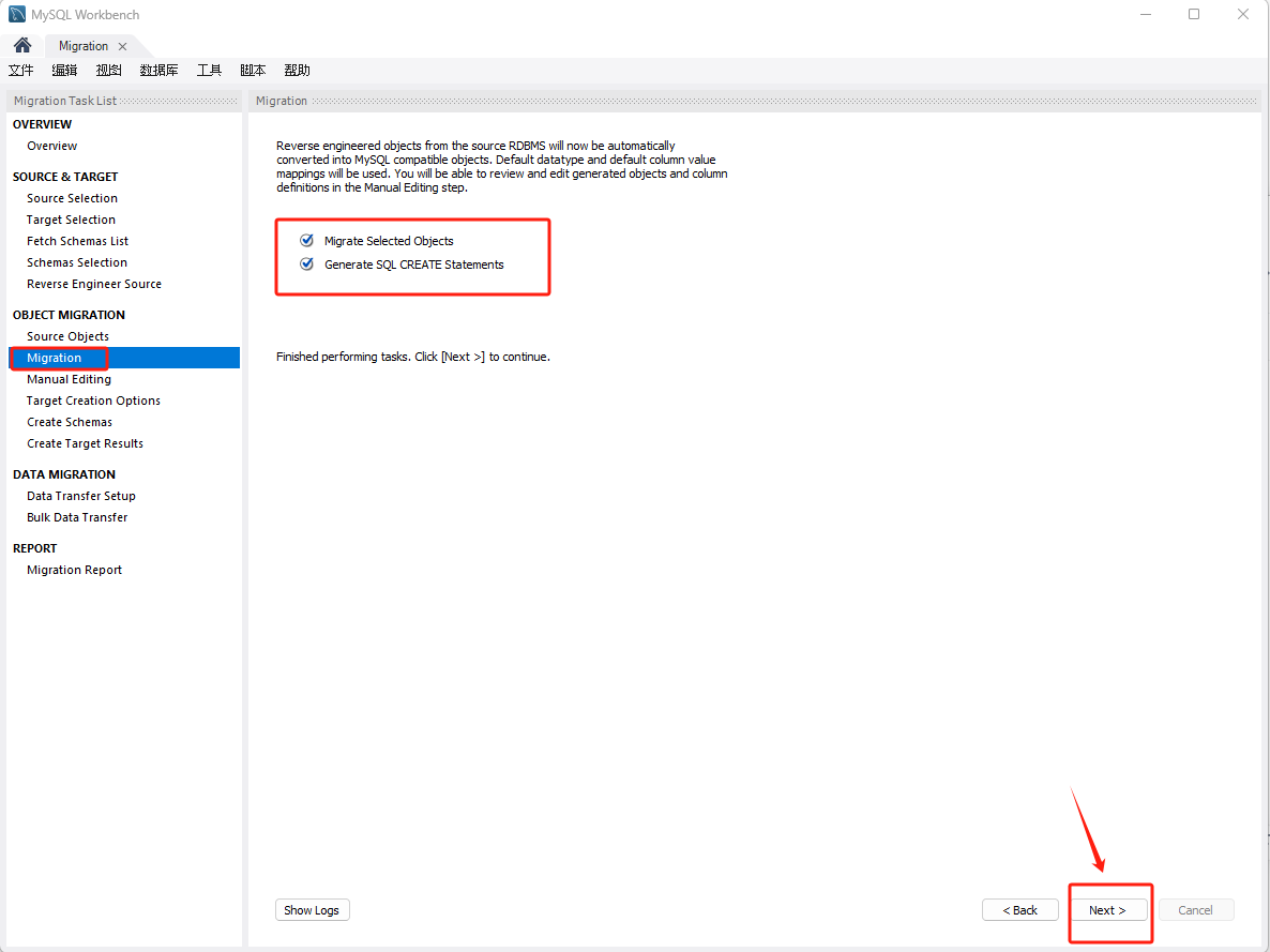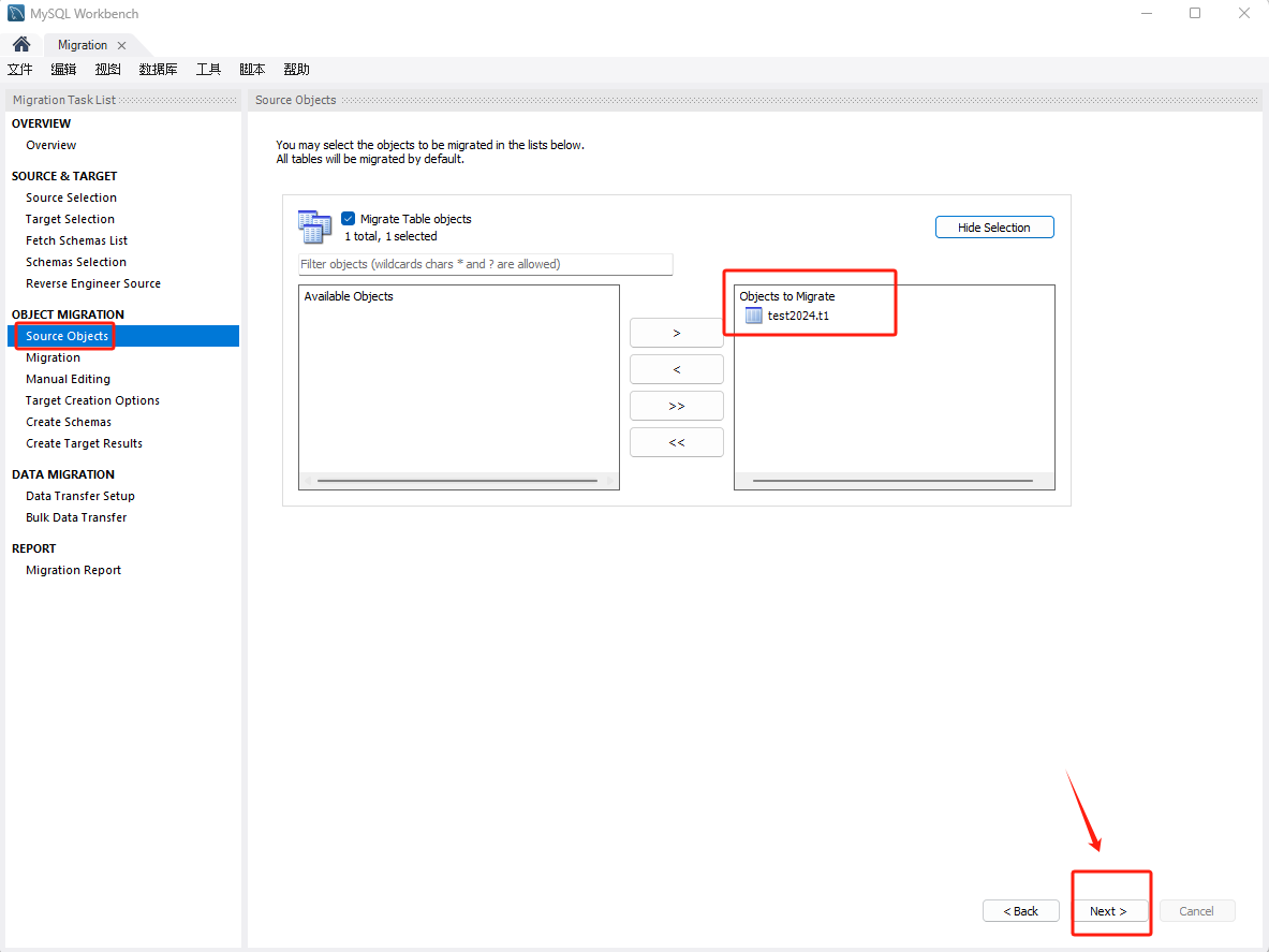 选择要迁移的对象,点击 Next