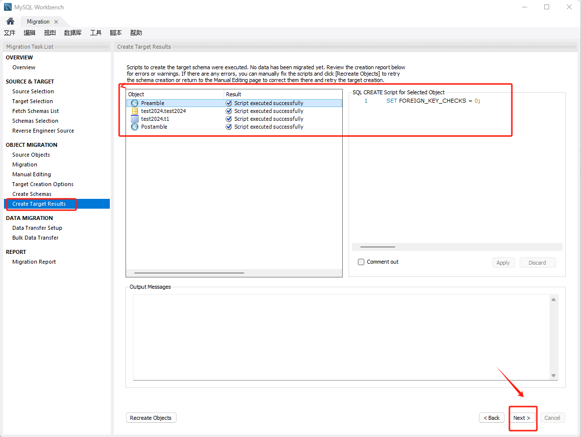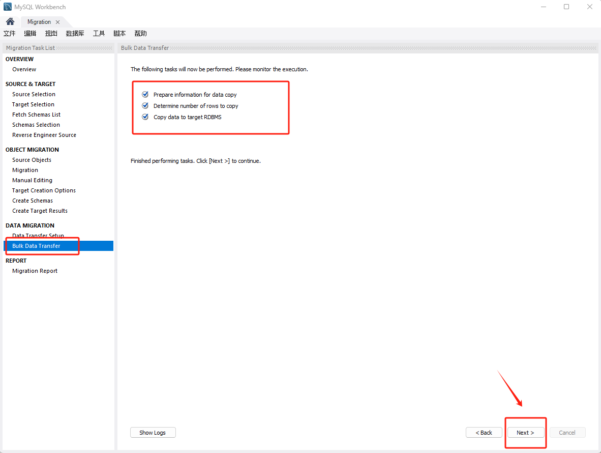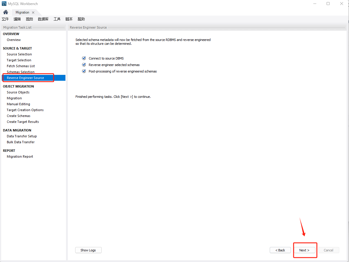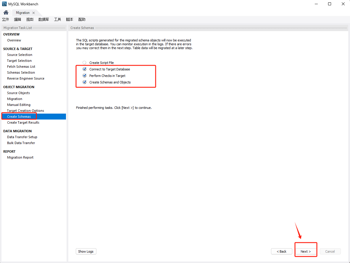 选择要迁移的对象,点击 Next