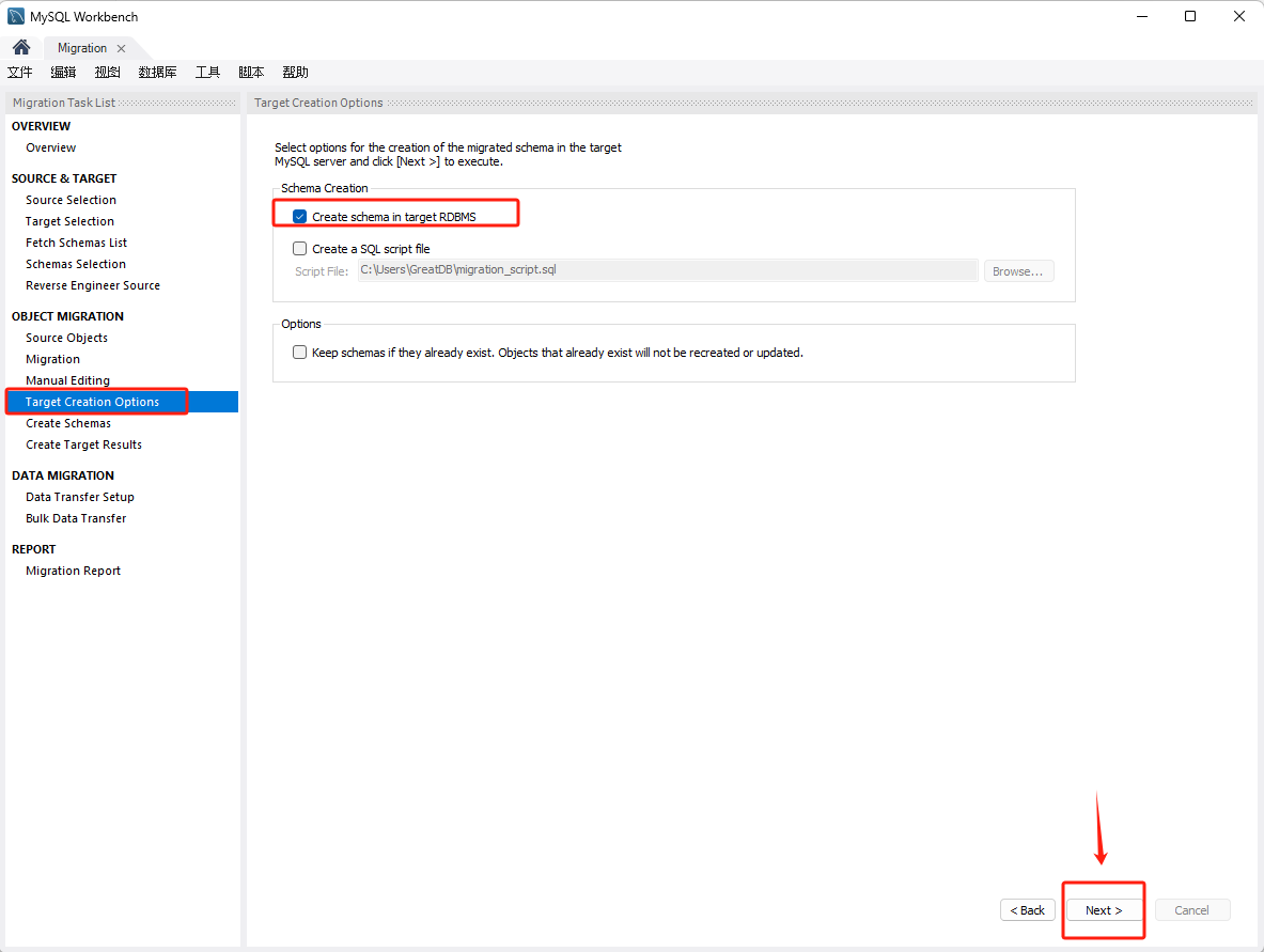 可以选择在目标端数据库创建对象、或者生成创建SQL的脚本文件或两者都可以选择。