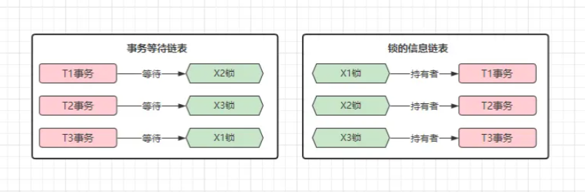 算法,该算法会以当前事务作为起点,然后从「锁的信息链表」中找到对应中锁信息,再去根据锁的持有者(事务),在「事务等待链表」中进行查找,看看持有锁的事务是否在等待获取其他锁,如果是,则再去看看另一个持有锁的事务,是否在等待其他锁.....,经过一系列的判断后,再看看是否会出现闭环,出现的话则介入破坏。