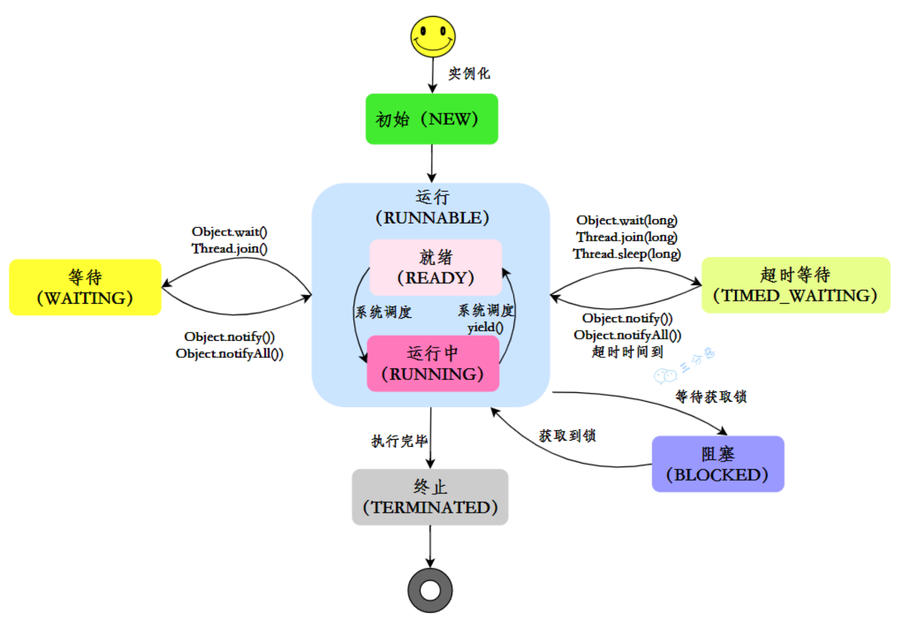 终止:执行完run()或抛出未捕获异常结束时,进入终止状态。