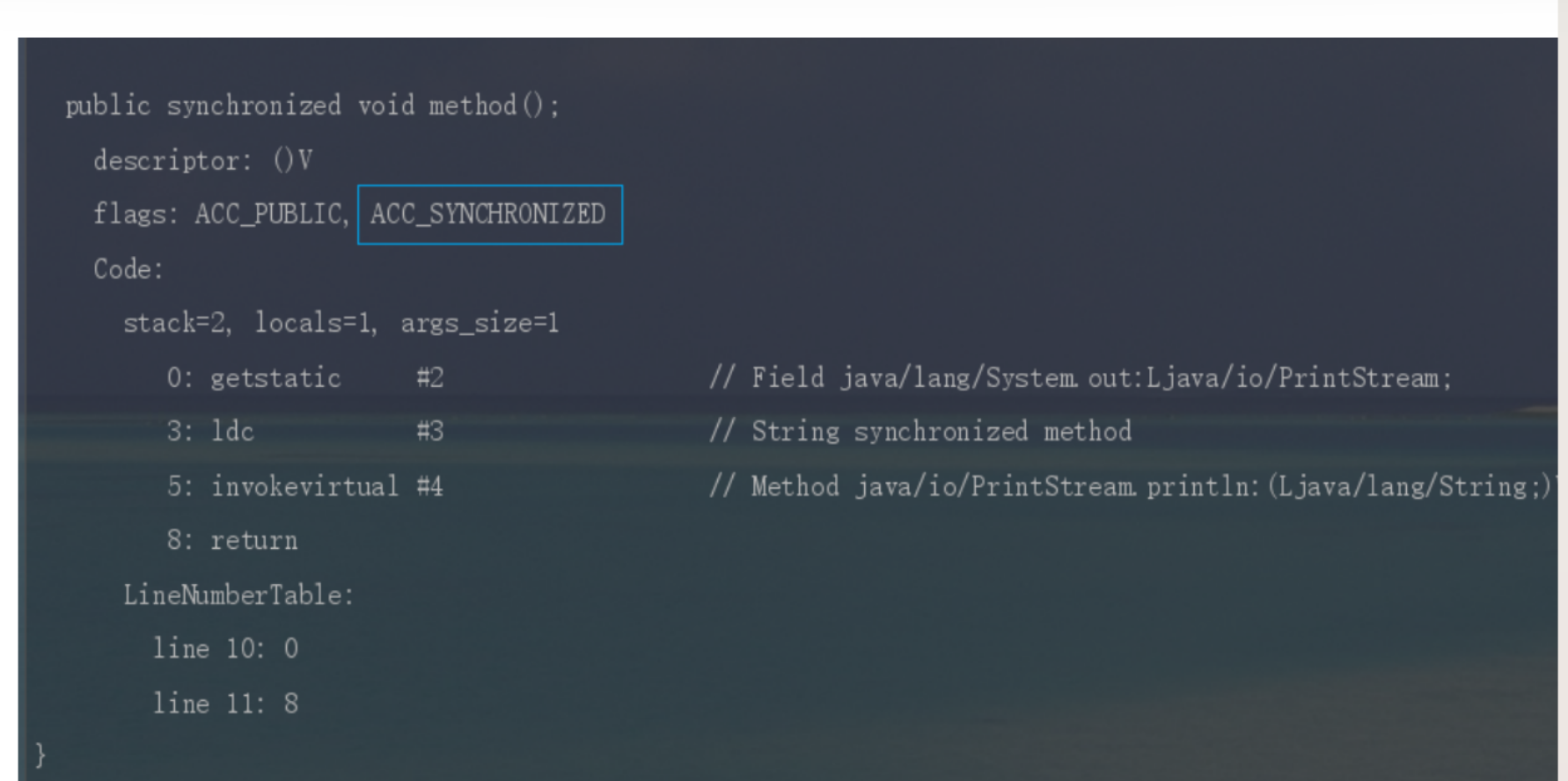 修饰方法:JVM在方法表里打上一个标志位ACC_SYNCHRONIZED。在执行时,JVM会检查:如果这个方法有这个标志,调用它时就会自动获取对应对象的Monitor锁-->执行完自动释放锁,不需要显式写lock/unLock。