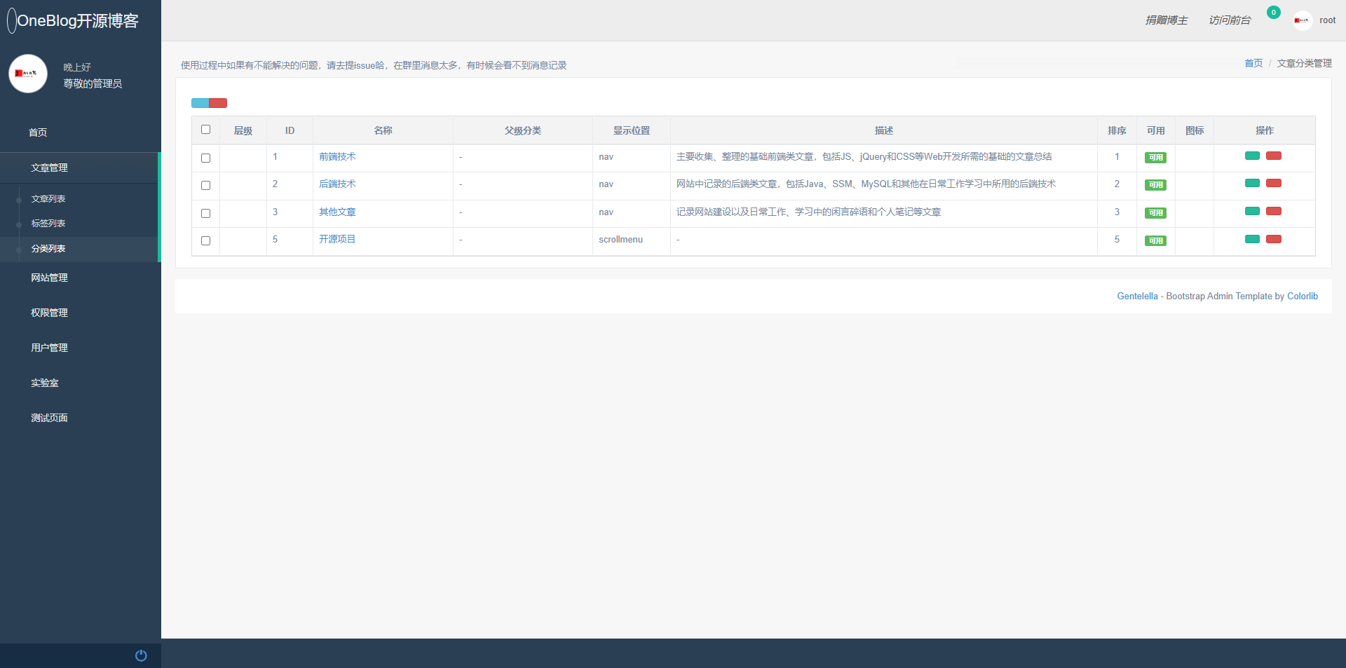 OneBlog ├── blog-admin - 后台管理模块 ├── blog-codegen - 代码生成模块 ├── blog-core - 核心包 ├── blog-file - 文件上传 ├── blog-web - 前台项目模块 ├── cli.sh - 打包脚本 ├── docs - 用来存放项目中一些其他文件 ├── contribution.md - 参与贡献代码的说明文档 ├── demo.md - 用作演示的文档 ├── README.md - 项目文档 └── update.md - 项目更新记录(一些小的无关紧要的更新不记录)