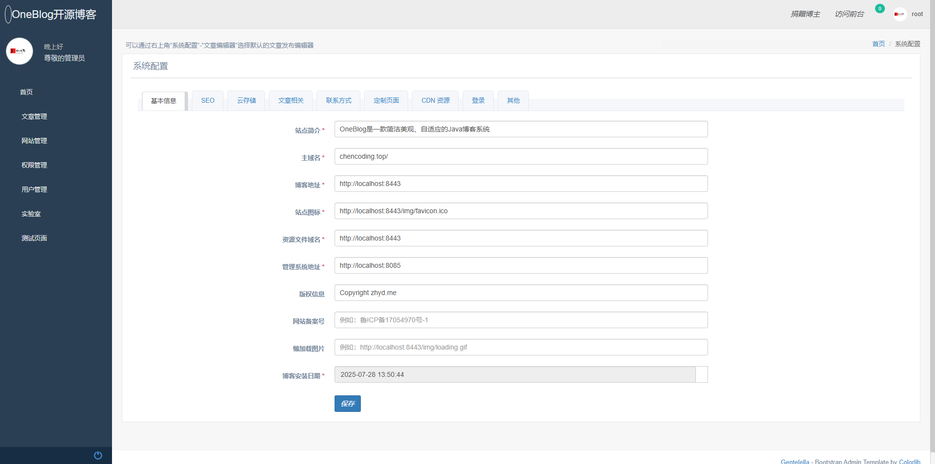 系统配置支持快速配置:可通过后台手动修改诸如域名信息、SEO 优化、赞赏码、七牛云以及更新维护通知等