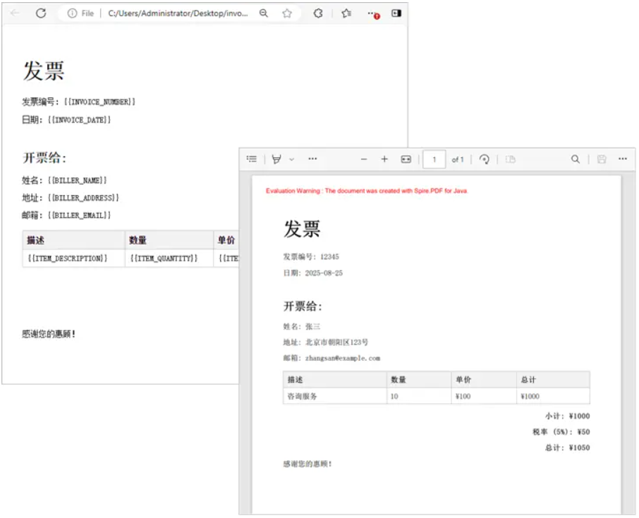HTML 模板非常灵活,允许你通过 CSS 样式 自定义文档布局和外观。在模板中,你可以定义 占位符 (使用 {{ }} 包裹),在运行时动态替换成实际数据,从而生成个性化的 PDF 文档。