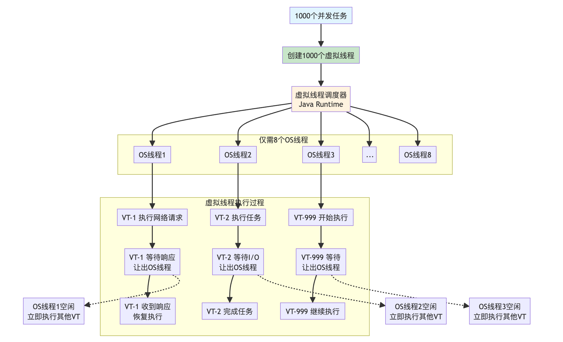 同样是 1000 个,但是 1000 个虚拟线程只需要很少的系统资源(比如映射到 8 个操作系统线程上);而且当虚拟线程等待网络响应时,会让出底层的操作系统线程,操作系统线程就会自动切换去执行其他虚拟线程和任务。